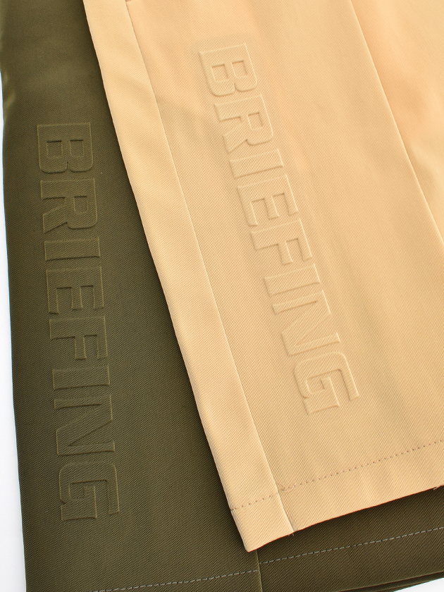 フロント側はベーシックなプリーツデザイン、バック側はヒップ部分で切り替えを入れたプリーツデザインと、前後異なるデザインを採用したプリーツスカート。目を惹くデザインなのはもちろん、特徴的な切り替えデザインによってスカートが広がりすぎることがなく、すっきりとしたシルエットに。BRIEFINGならではの機能美が表現された、こだわりの詰まったアイテム。タテ糸、ヨコ糸にそれぞれ異なるナイロンを用い交織させたストレッチ生地を採用。シャンブレー生地のような風合いと特徴的な光沢感が存在感を発揮。体の動きを妨げない優れた伸縮性・接触冷感機能・撥水性とアクティブなシーンで嬉しい機能を複数備えている。右サイドには凹凸で表現したBRIEFINGロゴを配し、さりげないアクセントに。